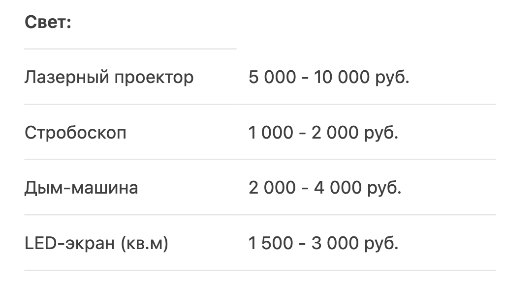 - Комплексные пакеты — заказ звука и света у одного подрядчика обычно на 15-20% дешевле